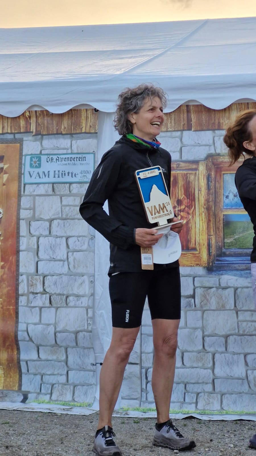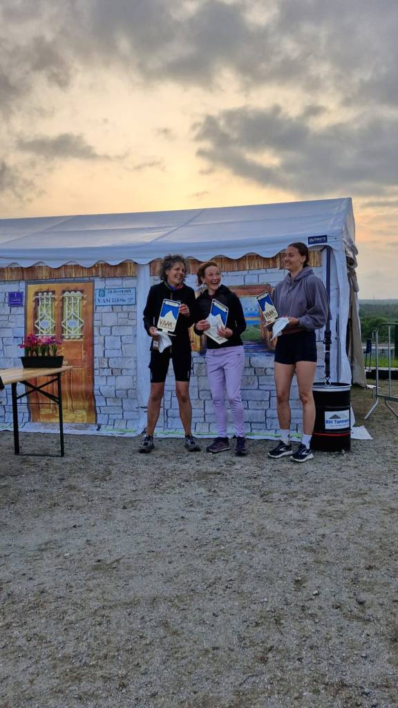 Om twintig voor negen ’s avonds finish ik m’n zeventiende rondje, en daarmee mijn race. Ik koop een ijskoud 0%-biertje. Verrukkelijk. Ik klap voor de mensen die nog binnendruppelen. Bob van der Weg, die ik in geen eeuwen gezien heb (zo lang dat ik even niet op zijn naam kom), komt bij me zitten en we praten wat over eerder en nu. Hij loopt niet meer veel hard, vertelt ie, maar liep vandaag toch een flinke afstand in zijn 12-uursrace. Ik ben 2e vrouw geworden op mijn ‘afstand’, en er is een officiële prijsuitreiking. Ik ben er blij mee, al is dat minder met de prijs dan met de bevestiging dat het goed gaat, dat lange lopen van me. Ik zal niet de oudste loper zijn geweest, maar ik denk wel de oudste met een prijs, als ik de verschillende podiumfoto’s bekijk 🙂 Luca, die ik ook bij de Hart van Drenthe heb ontmoet (ze maakte daar haar ultradebuut en werd meteen eerste vrouw op de 50 kilometer), had vandaag de hele tijd last van haar maag en stopte daarom met eten, maar liep toch nog zestien rondjes. Petje af. En ze maakte foto’s van de prijsuitreiking van mijn onderdeel (dank je Luca!).