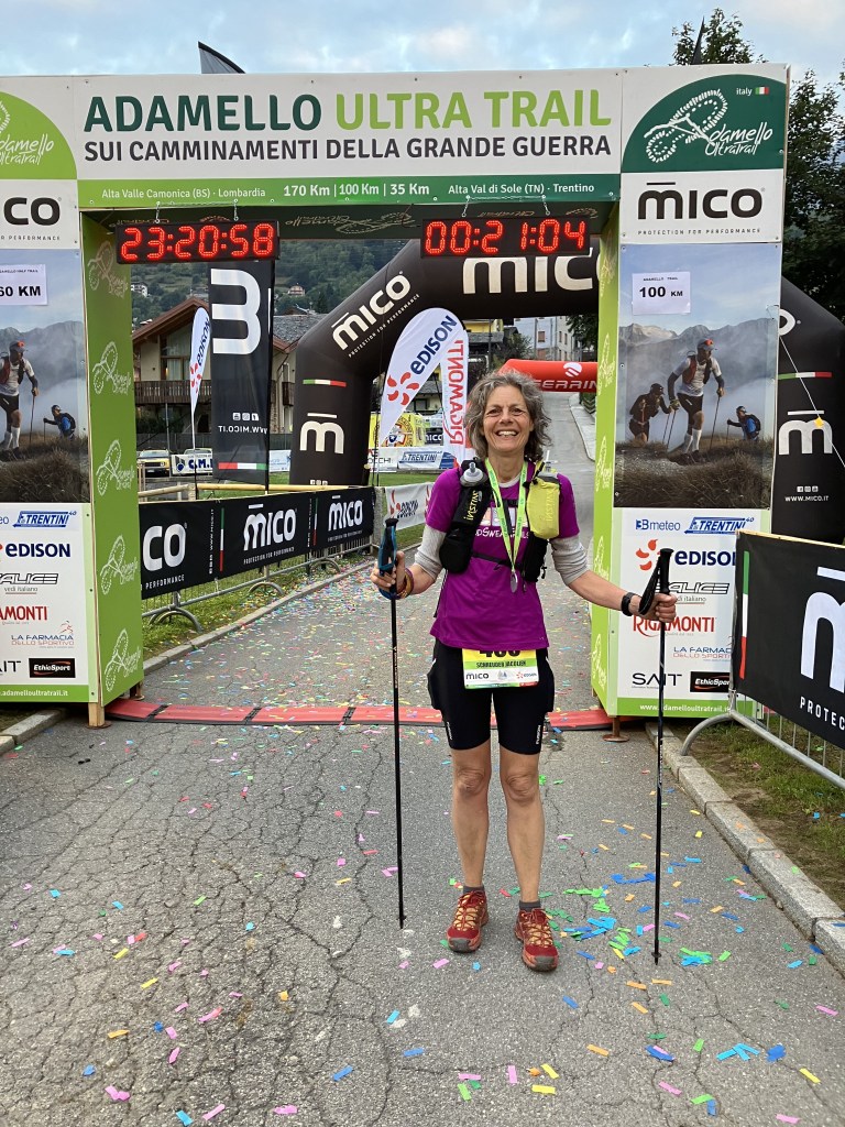 De tweede keer dat ik val, ga ik wat serieuzer door m’n rechterenkel dan de eerste keer. Ik heb heel even nodig om te voelen of het oké is, en om overeind te komen. Er komt me net een snelle 100 mijlloper achterop (2 uur later gestart dan wij, van de 100 km) die bezorgd vraagt of het gaat, en me maant ‘piano, piano’ te doen. Hartstikke aardig natuurlijk, maar ik merk dat ik me een beetje schaam en liever had gehad dat niemand getuige van m’n valpartij was geweest, dus ik maak niet echt contact en laat hem z’n pad vervolgen. Iets later, en stukken langzamer dan hij, ga ik hem achterna. Het is nog relatief vroeg in de race (al heb ik eigenlijk geen idee), en gelukkig is het ook meteen de laatste keer dat ik onderuit ga. Maar dat betekent niet dat het verder soepel loopt – vooral van het langzame, voorzichtige afdalen baal ik. De realiteit is: ik ben erg bang om te vallen en dat maakt het lopen er niet bepaald soepeler op. Een poos geleden gaf Kilian in een filmpje de tip (je kent ze wel, van die adviezen van een toploper voor ‘non elite runners’) om je voor te stellen dat je danst als je afdaalt, om op die manier soepel naar beneden te lopen. Eventueel kan je er zelfs muziek bij bedenken in je hoofd. Bij de tweede of derde afdaling tijdens de Adamellotrail denk ik aan dit advies, en de bijbehorende muziek komt meteen in mijn hoofd op en vergezelt me een groot deel van de rest van de tocht: ‘Dansen op de vulkaan’ natuurlijk 🙂 Al loop ik niet in vulkanisch gebergte voor zover ik weet, maar dat mag de pret niet drukken. Niet dat het een significant verschil maakt, maar als het dat niet doet, dan leidt het in elk geval af.